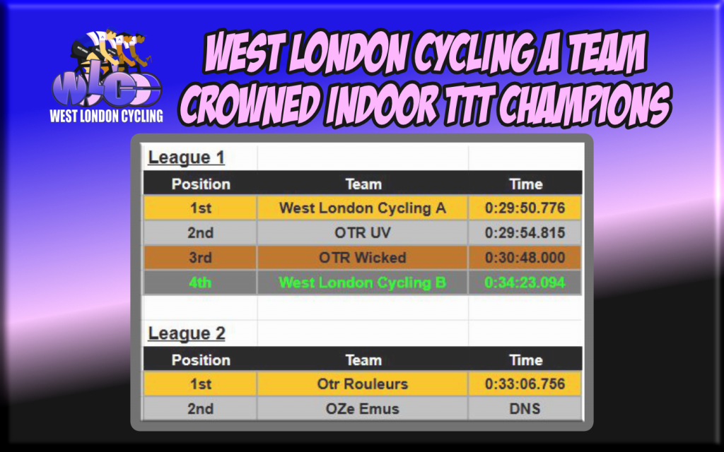 Congratulations to the West London Cycling online TTT A Team … who snatched victory in the Finals of the OTR Virtual TTT Series (Organised brilliantly by James Ogilvie of OTR).