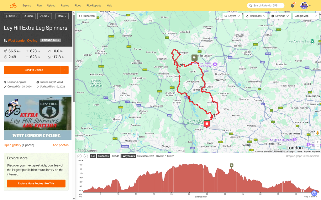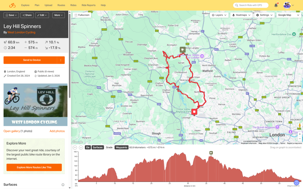 Ley Hill Spinners is an original from West London Cycling (the area’s leading route innovators), with a cafe stop at Blackwell’s in Chipperfield to enjoy just after half way around. We offer two route choices at 61km or 68km. It is anticipated that faster riders will take the longer route so that we can all enjoy each other’s company at the coffee stop which falls after the respective deviations.