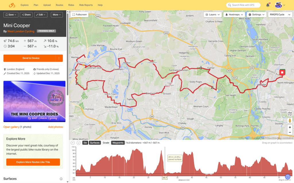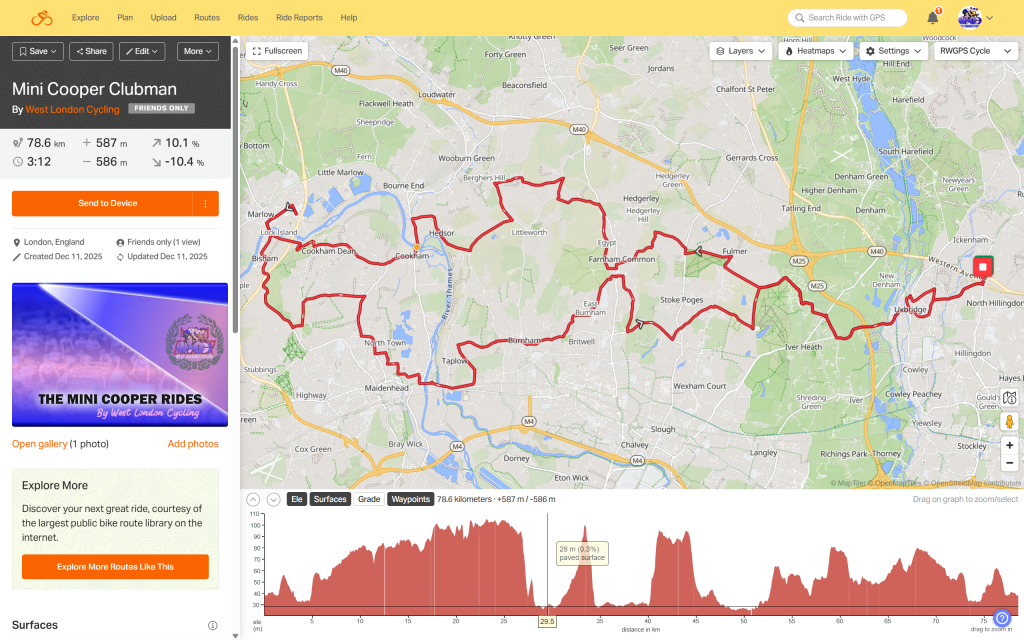 Mini Coper Ride and Mini Cooper Clubman are brand new additions to West London Cycling’s extensive and comprenhensive archive of local cycling routes (founded 2021). There is a cafe stop at 33 or 37km depending on which route yoou choose Centre.
