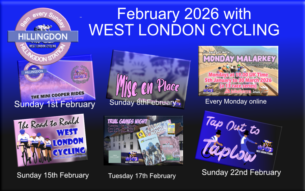 Another great month of Sunday rides from Hillingdon Station (UB10 9NR) ahead from West London Cycling plus another informal games night on Tusday 17th February at the Coy Carp in Harefield as well as our popular online racing every Monday on Biketerra.