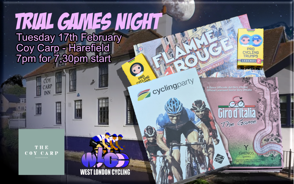 Tuesday 17th February 19.00 Trial Games night (social) at the Coy Carp Harefield .. testing out some cycling board games 7pm for 7.30pm start