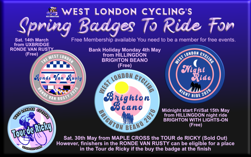 BRIGHTON WITH LIGHTS-ON is a 148km night ride to Brighton (Train Home) using our well tested route, tweaked a little for 2026 which has proved a ‘winner’ over the years. Start at midhight Friday / Saturday 15th May from HILLINGDON STATION. More details to follow.