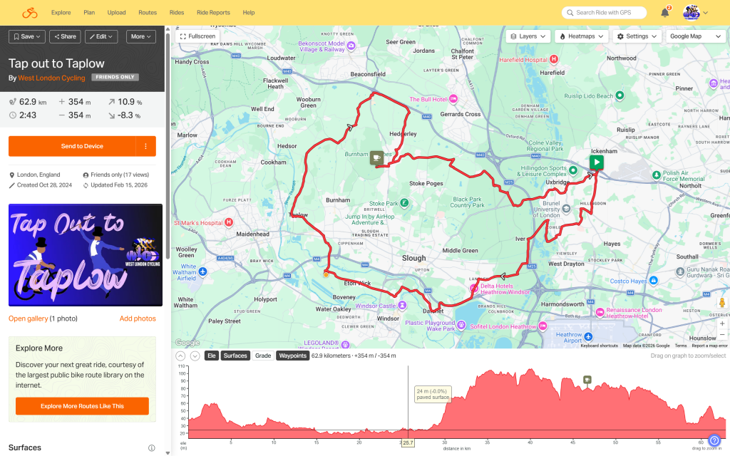 Tap out to Taplow and Tap, Tap, Tap out to Taplow are from West London Cycling’s extensive and comprenhensive archive of local cycling routes (founded 2021). There is a cafe stop at 47 or 50km depending on which route yoou choose Centre.