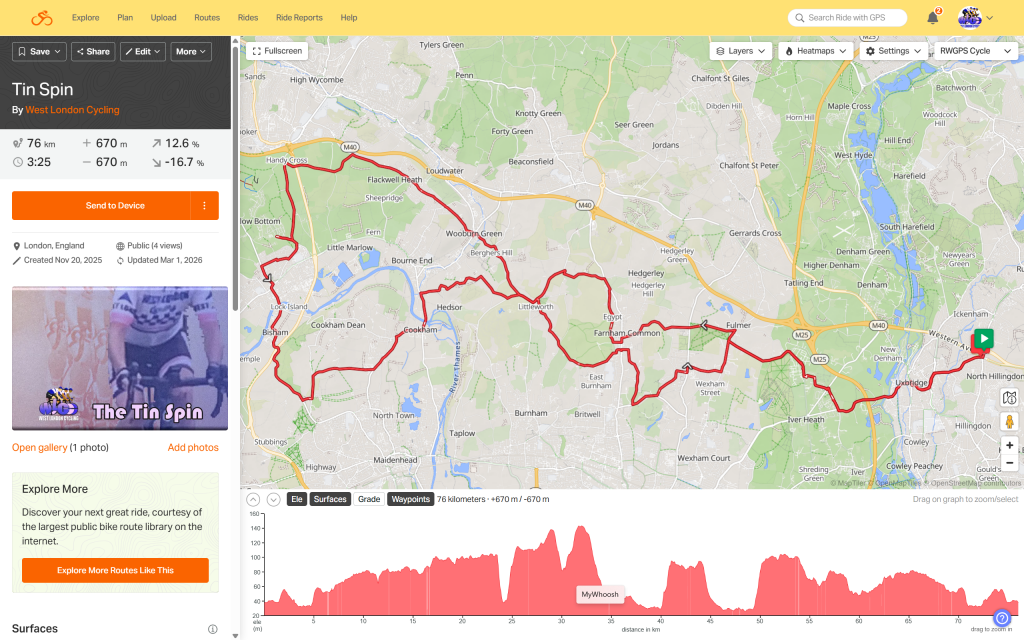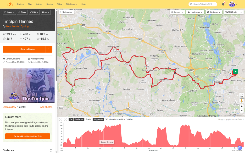 The Tin spin and Tin Spin Thinnedwith a Coffee Stop near Marlow are from West London Cycling’s extensive and comprenhensive offering of local cycling routes (founded 2021). There is a cafe stop at 32 or 35km depending on which route you choose.