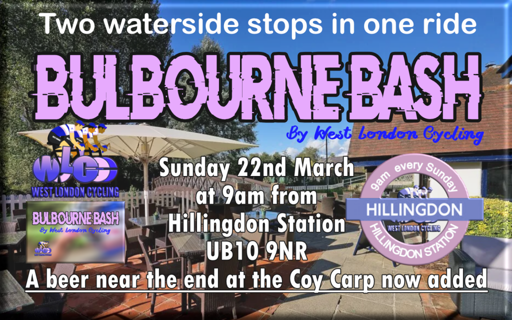 When the Coy Carp, with its beautiful waterside setting, invited us to stop by for a beer (or lunch if desired) on Sunday 22nd at March we said ‘yes’ straight away … so two waterside stops in one ride with a new route … join us at 9am at Hillingdon Station (UB10 9NR)