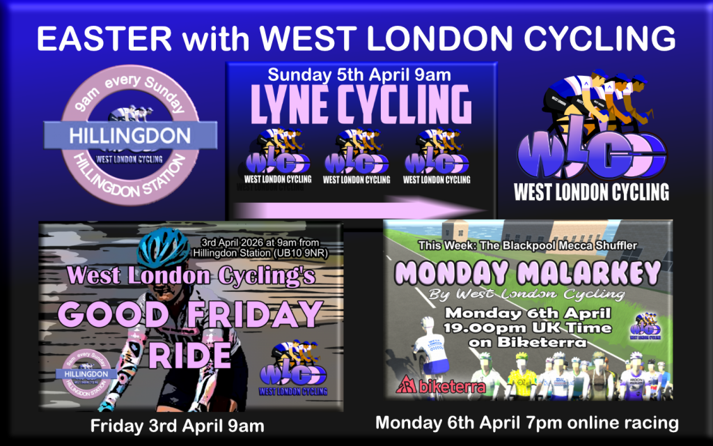 It’s a Bumper Bank Holiday Weekend with West London Cycling this Easter .. a couple of nice spins on Friday 3rd and Sunday 5th April from Hillingdon Station at 9am with our usual Monday Malarkey online race on Monday at 7pm on Biketera.