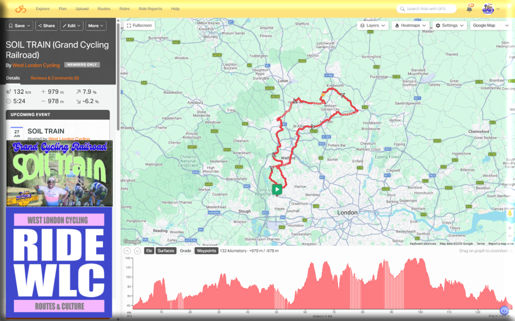 Another West London Cycling Original, Soil Train follows several disused railway lines and joins them up on the tarmac. Although the railway lines are not tarmac, they are hard packed and are rideable on a road bike, although gravel tyres would be slightly better.