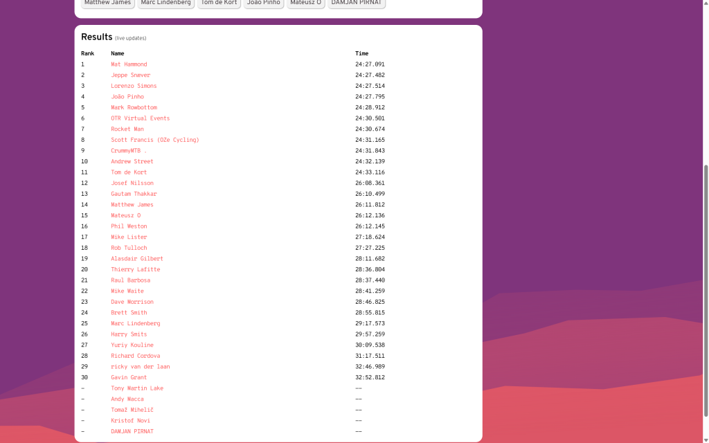 Lorenzo Simons now leads our good friend Crummy (who gets up at an unearthly hour to join the races from Australia) in the GC standings …. Thierry Lafitte is on their tails …